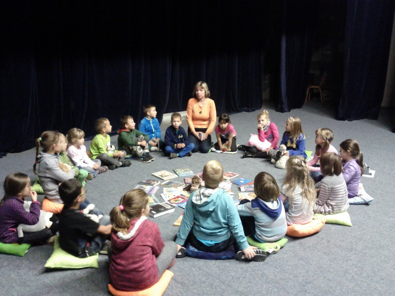 Dnes jsme se zvídavými prvňáčky a paní učitelkou Monikou Vyroubalovou četli na jevišti a taky se tam trochu báli. V knihovně jsme pak navrhovali obálku ke své oblíbené knížce. Nechybělo ani divadlo, hraní a zpívání...